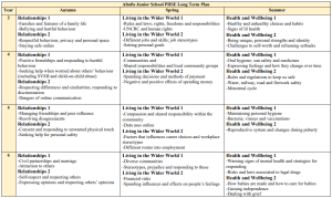 A clear and comprehensive scheme of work is in place. At Altofts Junior School, we follow the PSHE association scheme and include additional lessons to meet the needs of our school.